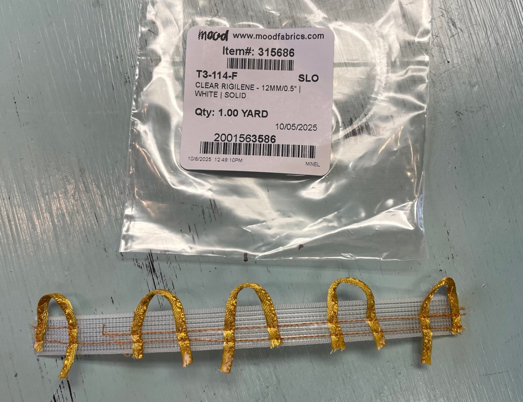 At this point, I went ahead and ordered the rigilene boning online. The project was delayed again while I waited for that to arrive, and was side tracked by other activities. Once it came and I was mentally ready to tackle this challenge again, I was able to sew the loops on to the very stiff rigiline boning, holding them in place with scotch tape.