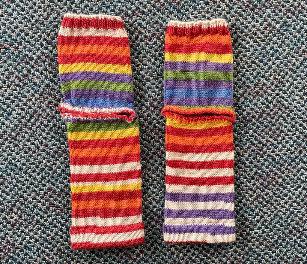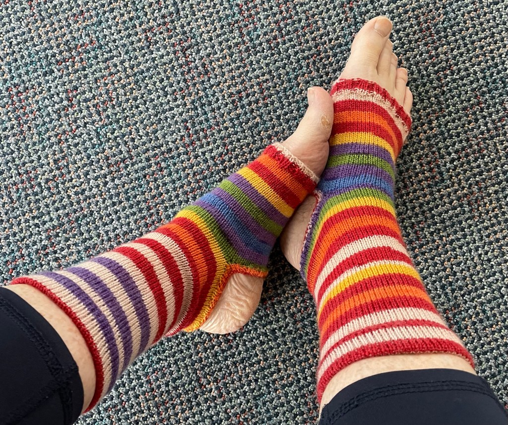 I experimented with making Yoga Socks. I do not know if anyone actually wears yoga socks, which have an opening where the heel and toe would normally be. There are CSM patterns for making the heel opening. I tried one but was not happy with the result. I tried again using an afterthought heel concept where you knit past the place where the heel will be, and then add the heel later, or in this case a slit. It was easy to crank a tube with the hung hem at the top. I picked up stitches on two rows above and below where the heel opening would be, removed the stitches on the row between, and then hand knitted a couple of rows of ribbing instead of a complete heel.