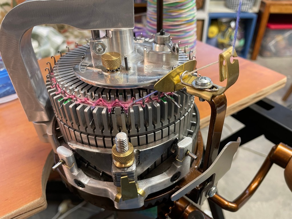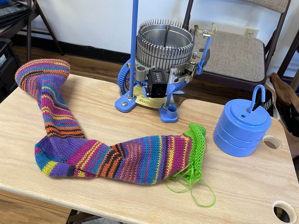 In February, I sponsored a crank-in at our 55+ resort in Arizona. Several people expressed interest on the AZ Crank-Ins Facebook page. Only one person came, but it worked out well. She had owned her beautiful periwinkle blue Erlbacher for two years, but had not ever actually made a sock. We worked together to get her tension at a good setting and made a couple of other adjustments to the machine. Then I guided her in cranking a sock step by step. A couple of non fatal mistakes were made, but it was a functional sock. The tension was a bit loose, but she will be able to try again with the tension a little tighter. I gave her the very detailed step by step instructions that I had written out for myself, that I no longer need.