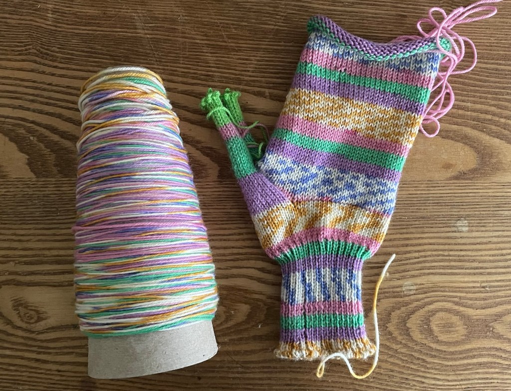The next photo shows an incomplete fingerless mitten with a thumb. I tried several versions of this. The mitt in the photo has a dropped stitch on the ribbed cuff. The end of the thumb and hand are not finished.