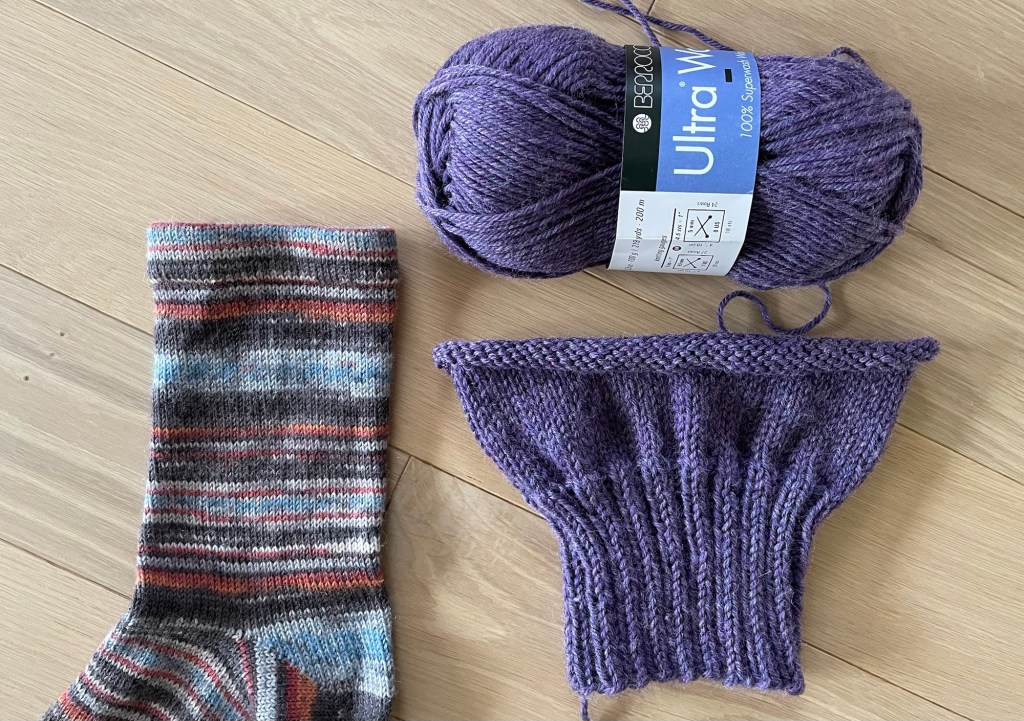 I cranked a pair for myself using Sweet Georgia Tough Love sock yarn in a variegated purple color. Wayne and I both wore our socks while watching a Minnesota Vikings football game.