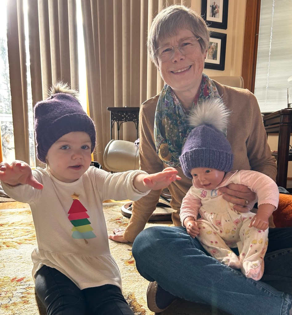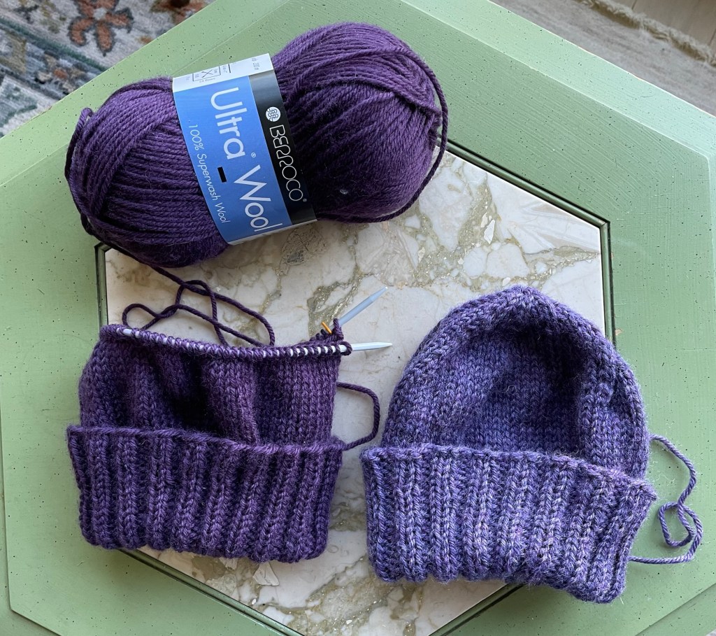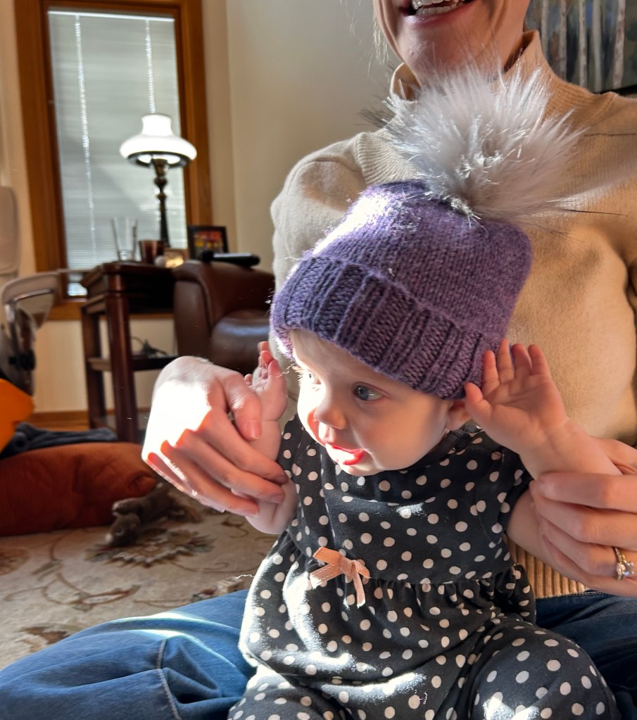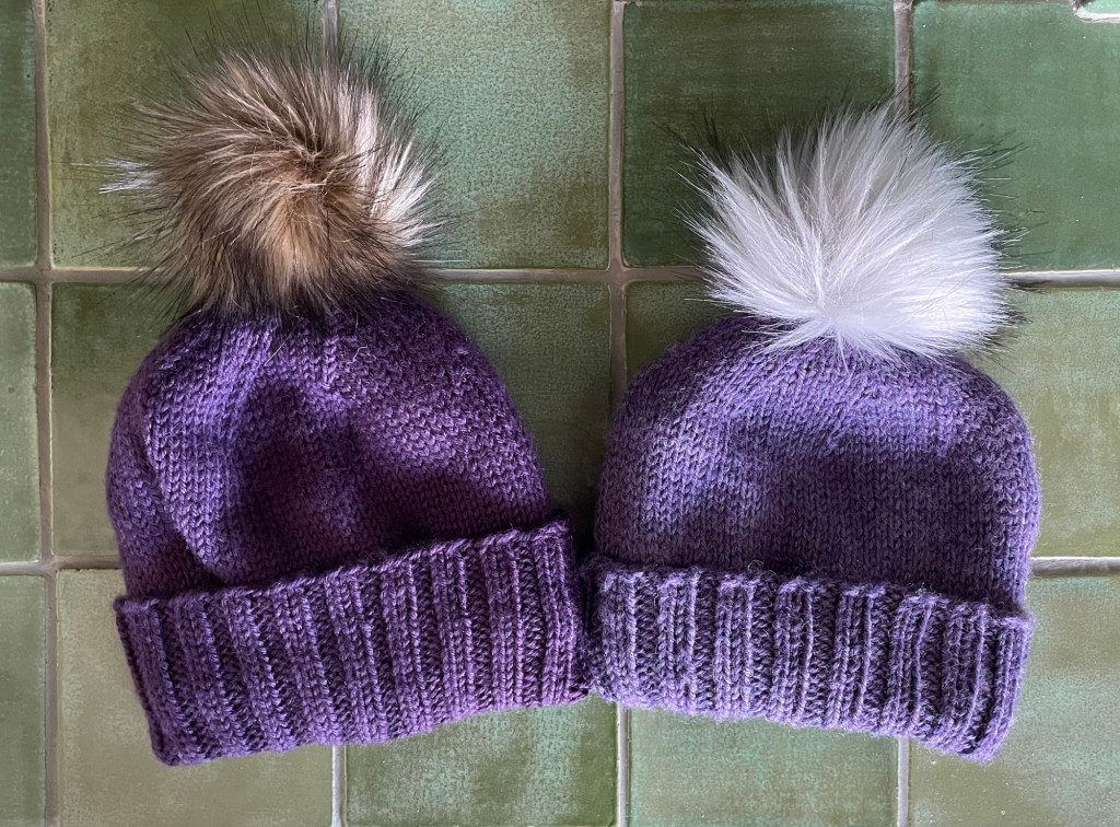 I was in between hand knitting projects for a while last fall. When we were at my son’s house in St. Paul, I offered to knit matching winter hats for the granddaughters. My daughter-in-law liked the idea. The timing was perfect at that moment, while the girls were napping, to hop in the car and run over to the Yarnery to pick out yarn. Kelsey selected two balls of super wash Berroco Ultra Wool in different shades of purple, so she would be able to tell the hats apart. Including the cost of pom poms which were as much as the yarn, these were not budget hats.