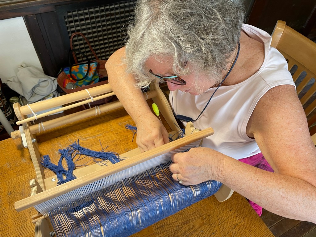 Threading the yarn ends through the heddles was a slow process for me. The ergonomics were not ideal. When sitting on a stool, I could not see the yarn ends coming out of the reed. Standing, I could see but had to lean over. I made sure to take breaks.