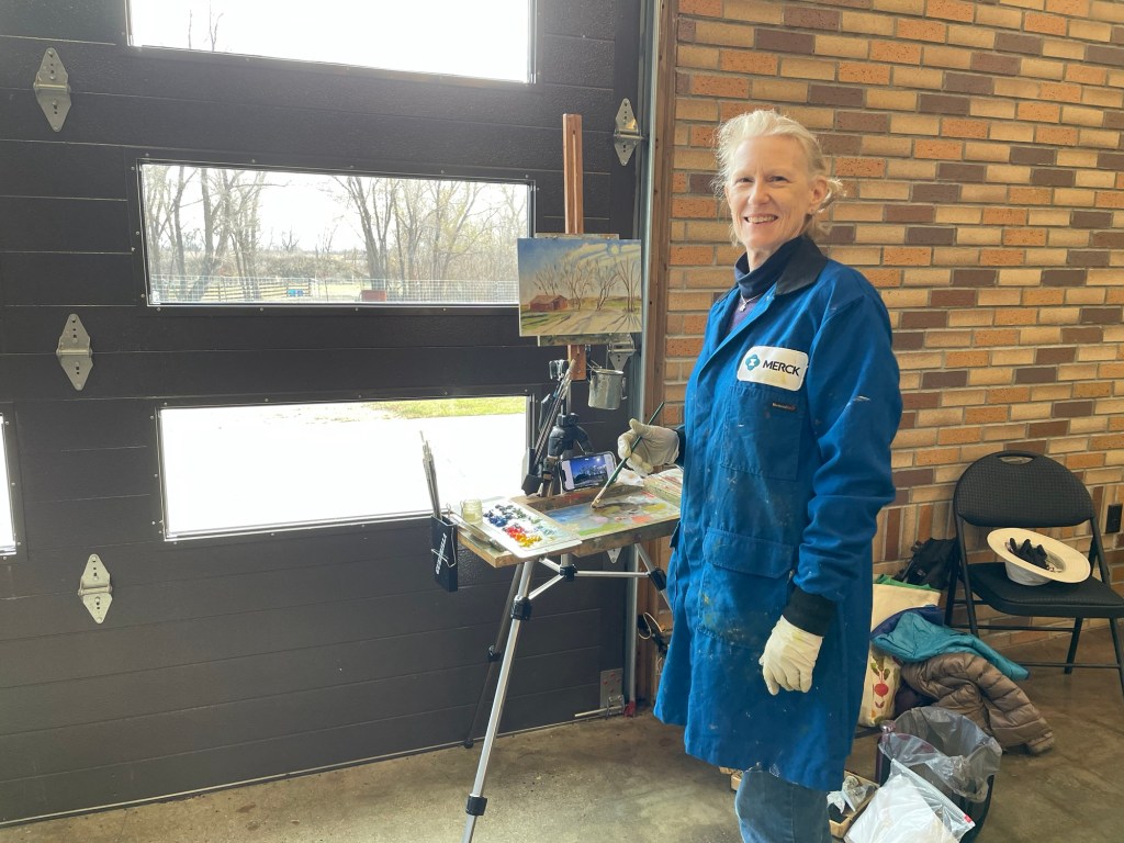 The large gymnasium is available for event rental. While we were there, a group of ladies with their sewing machines were making pillowcases for a battered women’s shelter. In the photo below my sister is painting at the far end near the big garage door. She had started working outside, but it ended up being too cold and windy.