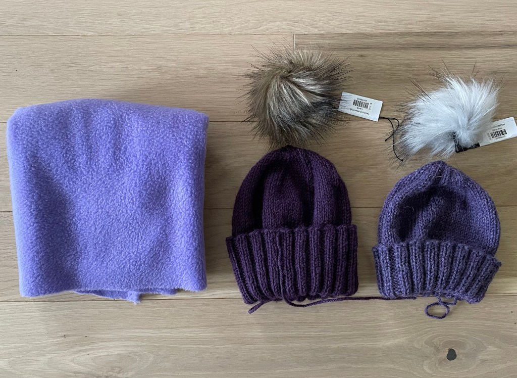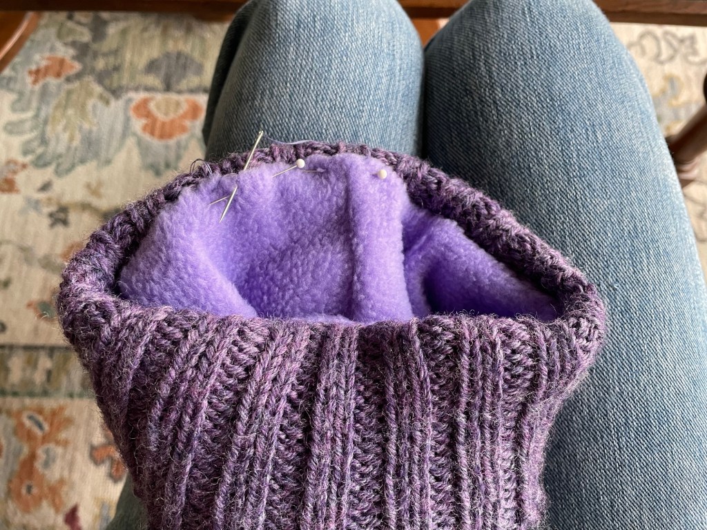Kelsey had requested the hats be lined with polar fleece. That adds another layer of warmth for Minnesota winter, protection from the wind, and a soft surface against their head. It also adds complexity to the project. I did not have a pattern, and the lining would have to be custom fit. Shopping for fabric is problematic these days, but on one of my trips to the Twin Cities I found a lavender color of polar fleece at Hobby Lobby that worked for both hats.