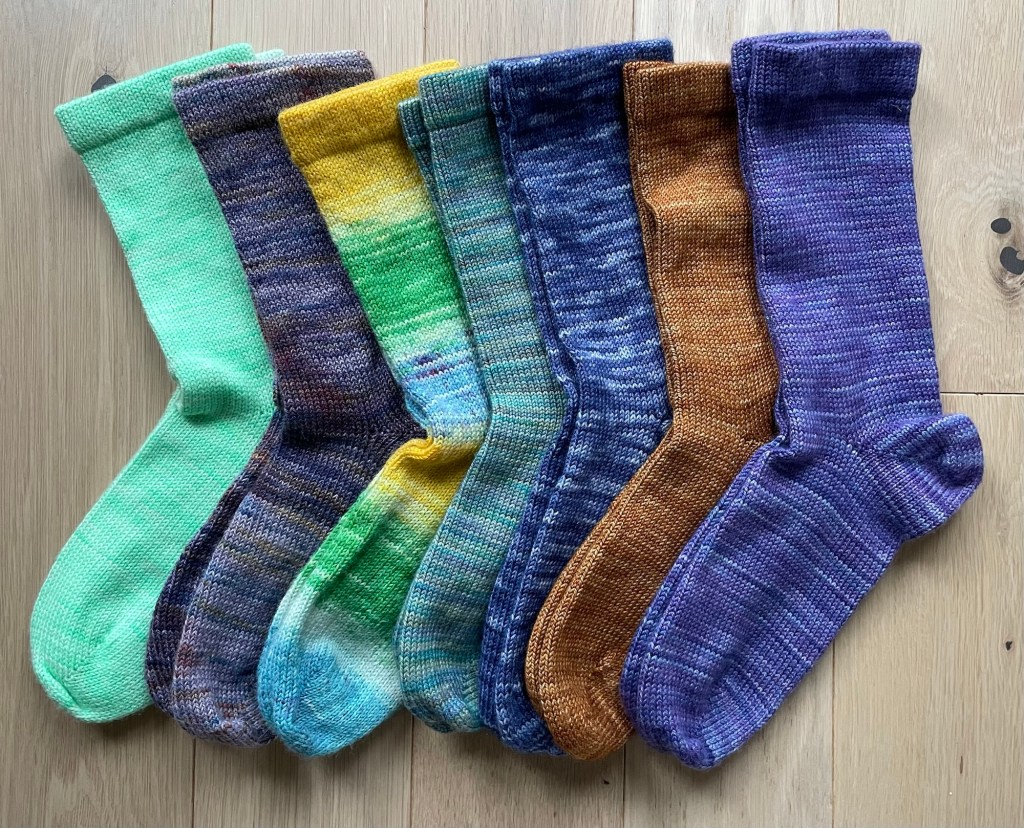 After owning my Erlbacher Circular Sock Machine (CSM) for more than a year, I am comfortable knitting a basic sock without looking at any instructions. I have cranked quite a few pairs of socks for myself and for others. Following is a photo of seven pairs I made for myself .