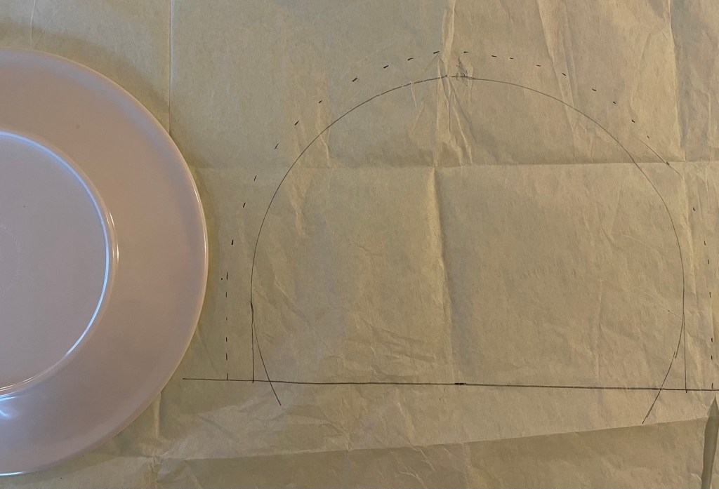The final step was making the polar fleece linings. I looked online for ideas on how to do this. One source suggested laying the hat flat and drawing around it, then cutting out two layers of the lining in that shape and sewing them together. At first I was going to ask Wayne to hold a hat stretched out while I measured it, but then I realized that one of our melamine salad plates was exactly the right size. I put the plate inside the hat and drew around it.