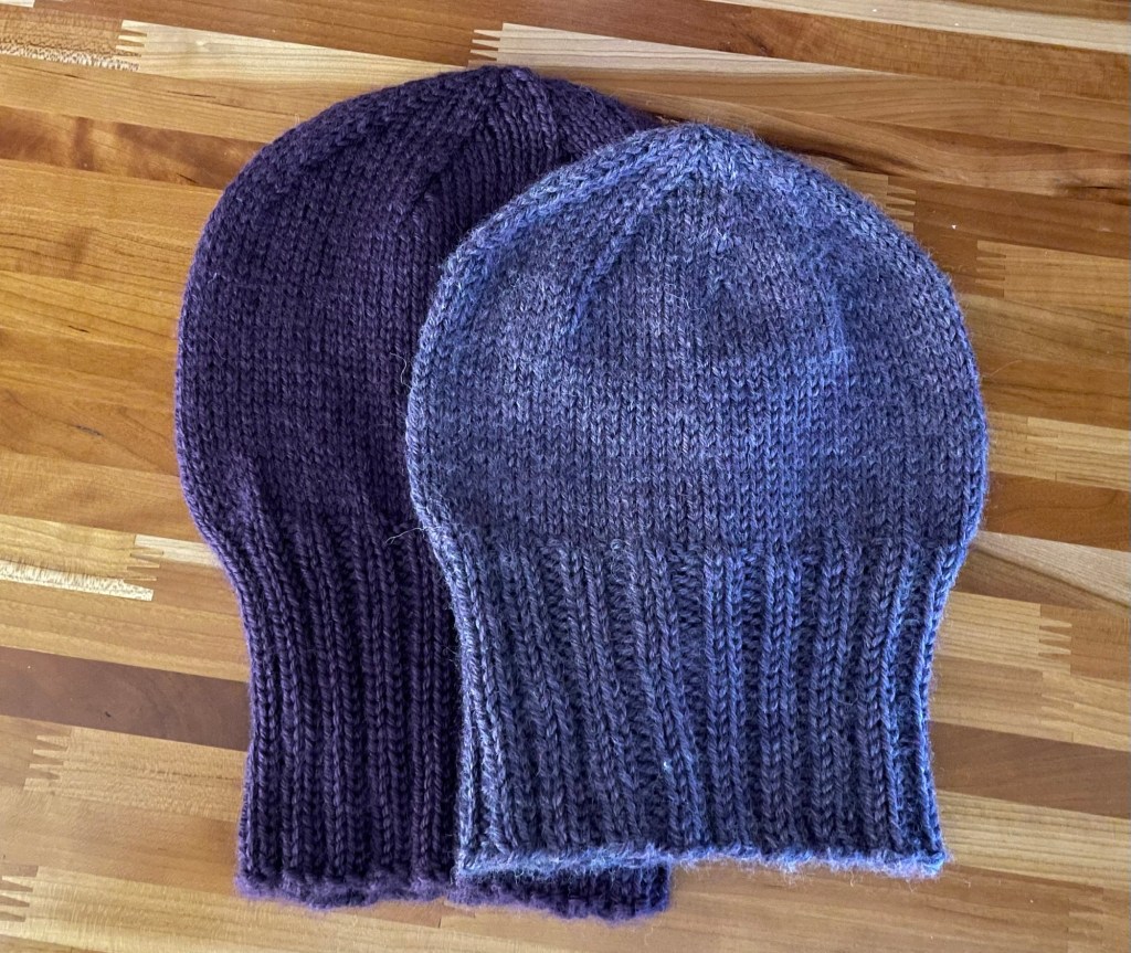 I do not have a good history of blocking my knitting projects. I know you should, so I soaked the two completed hats in warm water with a bit of soap, rinsed them out carefully and laid them out to dry. I also washed and dried the polar fleece in case it might shrink a bit. I did not think it would, and I doubt these hats will ever get washed. However I have been burned in the past when I did not prewash fabric, and then after a garment was finished it shrank when washed. After blocking the hats looked nice.