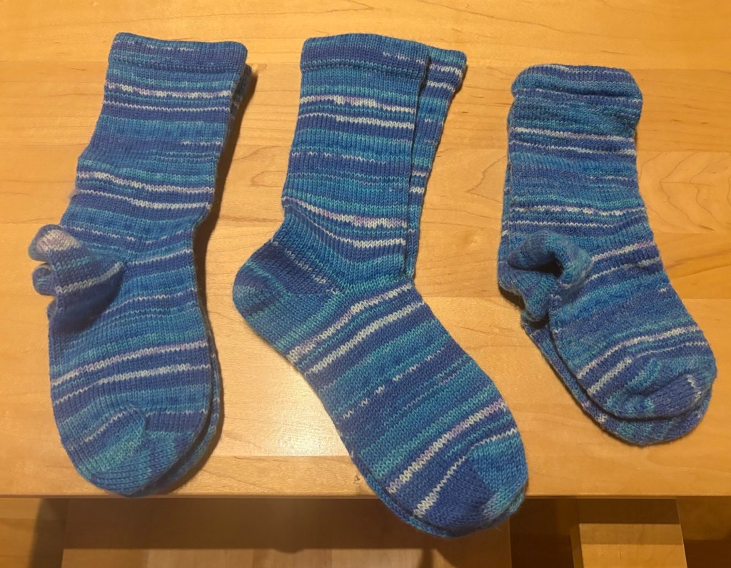 Once I had the 54 needle cylinder, I cranked a third pair of socks for Mary Jo to see how that would fit compared to the others. She sent me a photo of the three pairs of socks next to each other. They all have the same number of leg and foot rows. The pair on the right has Lycra. She reported that the socks with the Lycra fit the best. This is good information.