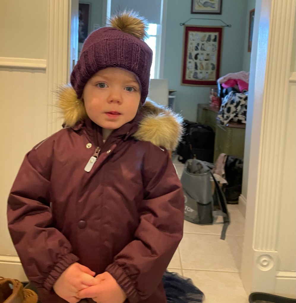 James took Blair outside and down the backyard towards the lake, after Kelsey got her bundled up in her snowsuit. In the photo below she is holding a cooler pack that she sometimes requests for an “owie”, whether she actually has one or not.