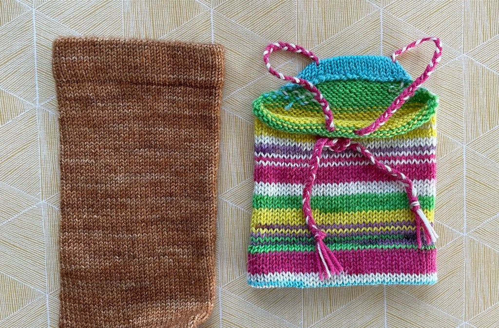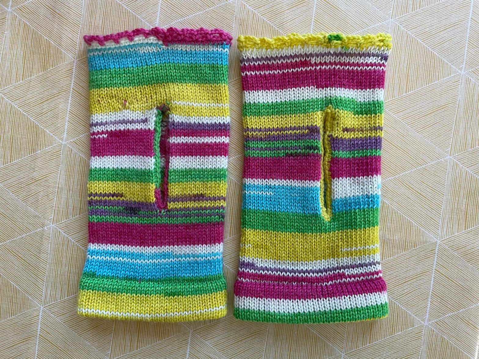I used a looser tension than for socks so it would be big enough around. The back of the dress is shown in the following photo, next to one of my CSM socks for comparison.