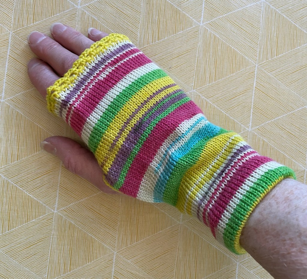 I tried another pattern with mock ribbing that had every forth needle removed. It is much easier than actual ribbing with the CSM, but I did like the look of it. There is another way to do a fingerless mitten with a slot instead of an actual thumb. I modified the pattern to add a crochet border around the slot and at the end of the hand. The pair in the photo below has a hung hem at the wrist. The same concept could have a ribbed cuff. I may try more variations, but honestly I am not very motivated to make more fingerless gloves.