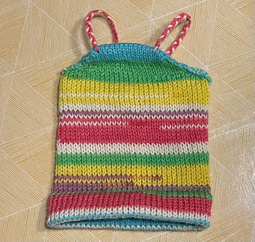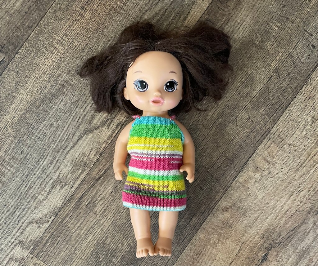 Our children and grandchildren were visiting in Arizona for a week. Before they got here, I went to Goodwill and bought some toys and books so the toddlers would have some things to play with. One purchase was a doll that did not have any clothes on. She seemed like the right size for a sun dress made with the sock machine. I cranked a tube with a hung hem, and a sort of mini heel at the top that was tacked down. I braided some yarn for straps.