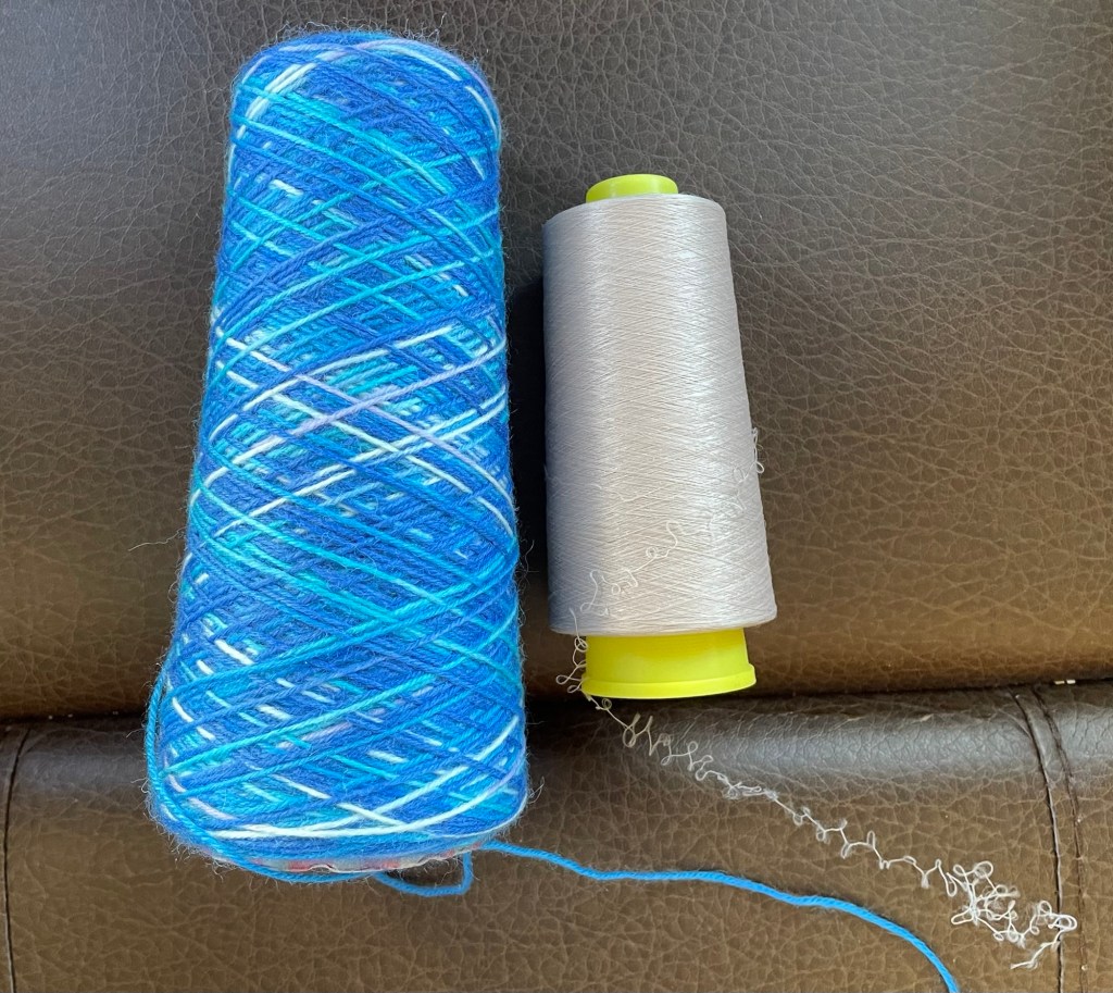 I wanted to make socks for my son’s mother-in-law, Mary Jo, who has small feet. First I cranked a pair using the cylinder that I use for ladies socks, with the right number of foot rows for a size six shoe. I was not surprised that it was a little big around. I tried again adding a strand of Lycra yarn with the regular sock yarn. This makes the fabric gather in more than the plain sock yarn, and the sock stretches out as needed on the foot. Some people do this for every pair of socks. This was my first try using Lycra, and although it accomplished the purpose, I am not sure I like the way it changes the color of the sock. It comes in different colors, but I only have one cone of an off white as shown in the photo below.