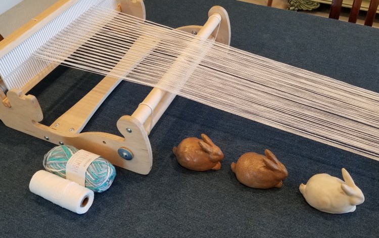 The dining room table with all the leaves is just the right warp lengthMy mom’s ceramic bunnies kept me company while working on this project