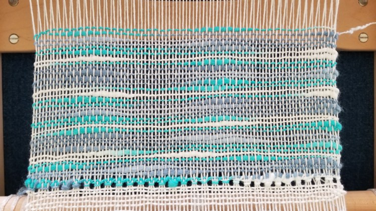 I wove random amounts of each of the various weft yarns using plain weave in most cases, but waffle weave for the green 8/4 cotton.