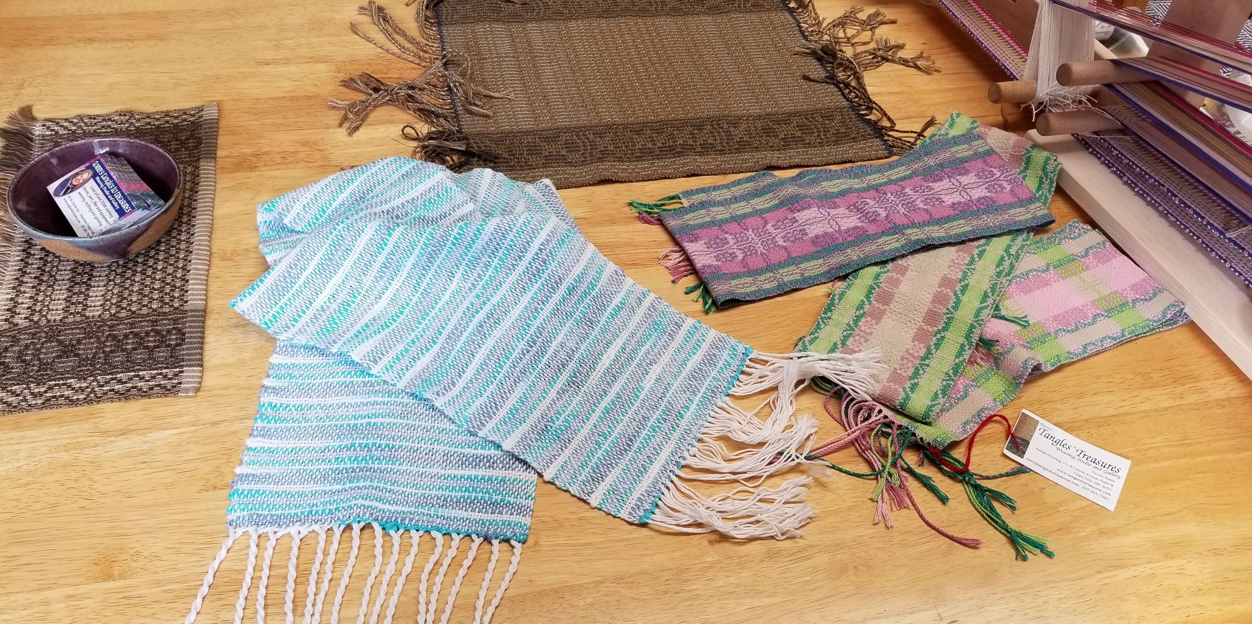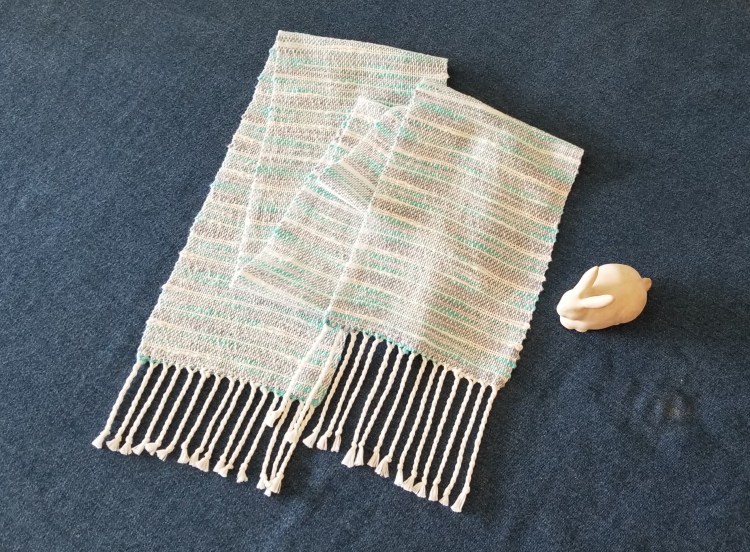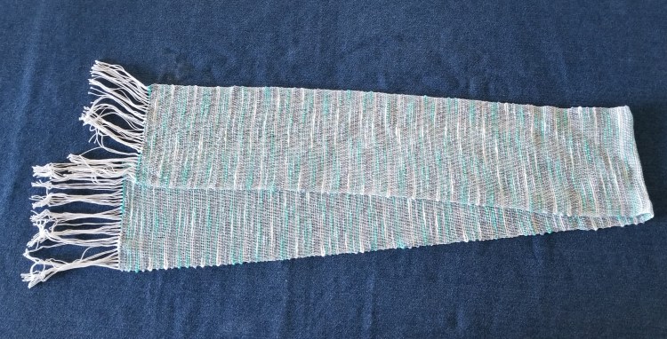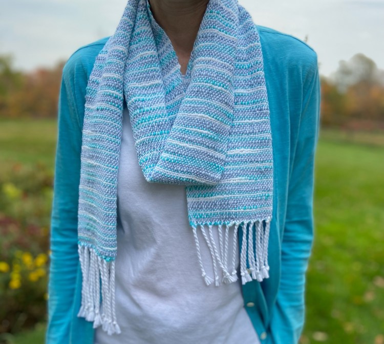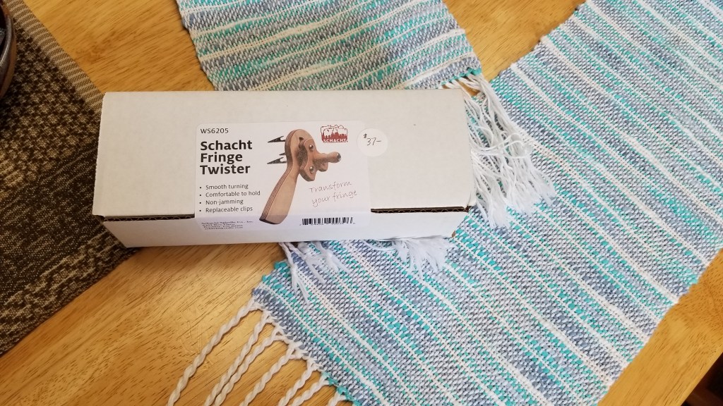 I had some questions for Torri, my weaving mentor at Tangles to Treasures in Fergus Falls, about options for the fringe. There are various methods and options for what to do with the ends of the scarf. Torri sells Schact weaving and spinning equipment including a gadget called a “Fringe Twister”, as seen in the photo below on Torri’s work table, but you can accomplish the same thing by hand. I have not succumbed to temptation to buy one of these….yet. Twisting fringe involves taking two adjacent groups of warp yarns, twisting each group, and then twisting the two groups together in the opposite direction. There are youtube videos showing how to do this. The result is a very professional looking finish rather than letting the yarns hang loose. Leaving the yarns loose can be an option too, depending on the yarn you are using and what look you are after. I considered making an infinity scarf by sewing the ends together with fringe, or by cutting off the fringe first. In the end I decided to leave it as a rectangle shaped traditional scarf with the twisted fringe.