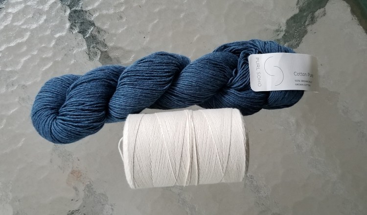 I have some 100% cotton yarn in my stash, so I decided to try using some for weaving a scarf. Wool scarves can be scratchy and some people are allergic to it, so cotton is a good lightweight hypoallergenic alternative that can be worn year around and in warmer climates. I picked out white 8/4 weaving yarn that I had used for dish towels, and Sirdar Beachcomber 100% cotton thick and thin variegated yarn, in a combination of turquoise, dusty blue and white.