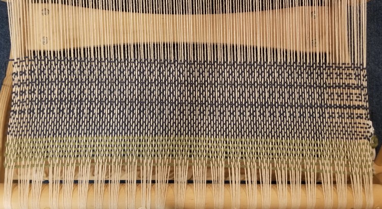 You can see three repeats of the blue waffle weave pattern in the photo below, after the blue plain weave rows for the hem, and green header rows which will be removed.