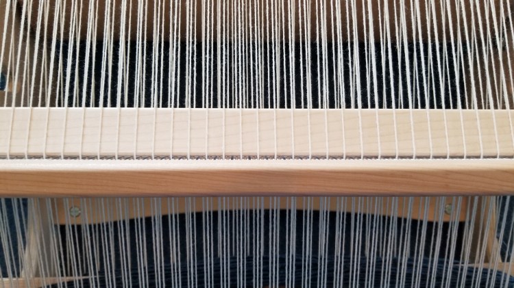 The first part of the warping process involves threading the yarn through the slots of the heddle and stretching it out across the dining room table and back, so that you have two yarns per slot. After that you wind most of the warp yarn on to the back beam. Then the next step is removing one of the warp yarns from each slot and threading it through the adjacent hole in the heddle. For this pattern the darker yarn has two yarns in the same space rather than one. In the photo below you can see on the right side where there are two warp yarns in each slot. On the left side I have moved warp yarns into the holes. Normally there would be one yarn in each hole and slot at the end of this step. In this pattern the darker yarn has two yarns, whether it is a hole or slot.