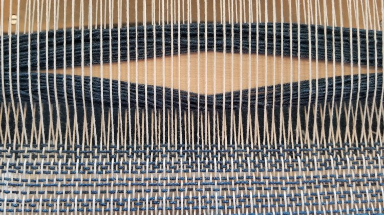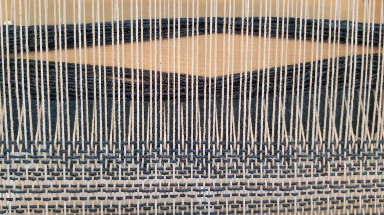 The next photo is a close up of two repeats of the six waffle weave rows. The shuttle of blue yarn is making the first row of the next repeat, which is every other yarn.