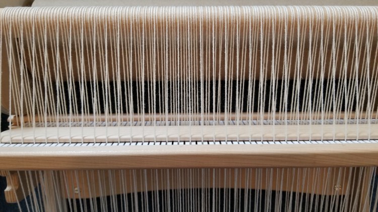 I was not sure whether to use the 8 dent or 10 dent heddle for the warp yarn. There is not a right or wrong, but using the 8 dent heddle would result in fewer yarns per inch for a looser fabric. I used the 10 dent heddle for the dish towels with the same warp yarn, so that seemed like what I should use. I knew that I could start over if I did not like the result.