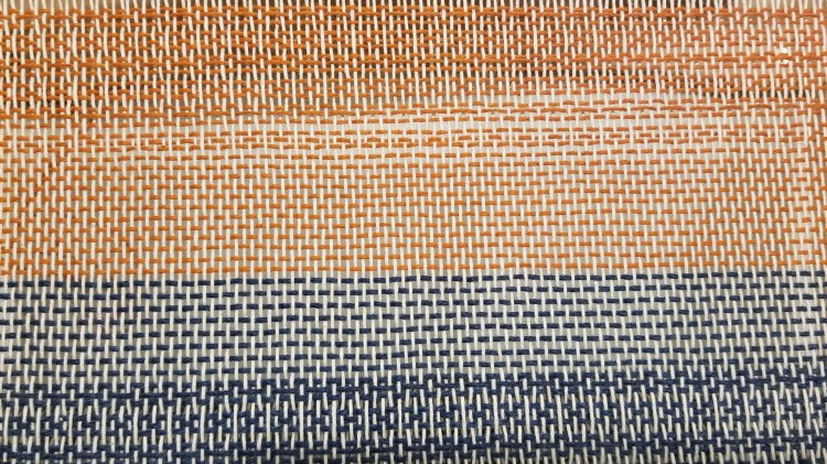 I wove some plain weave rows at the beginning and end of each towel that would become part of the hem. The following photo shows the end of the first blue towel and the beginning of the second orange towel. After removing from the loom and washing the weave will become more dense due to the yarn not being under tension and shrinking in the washing machine and dryer.