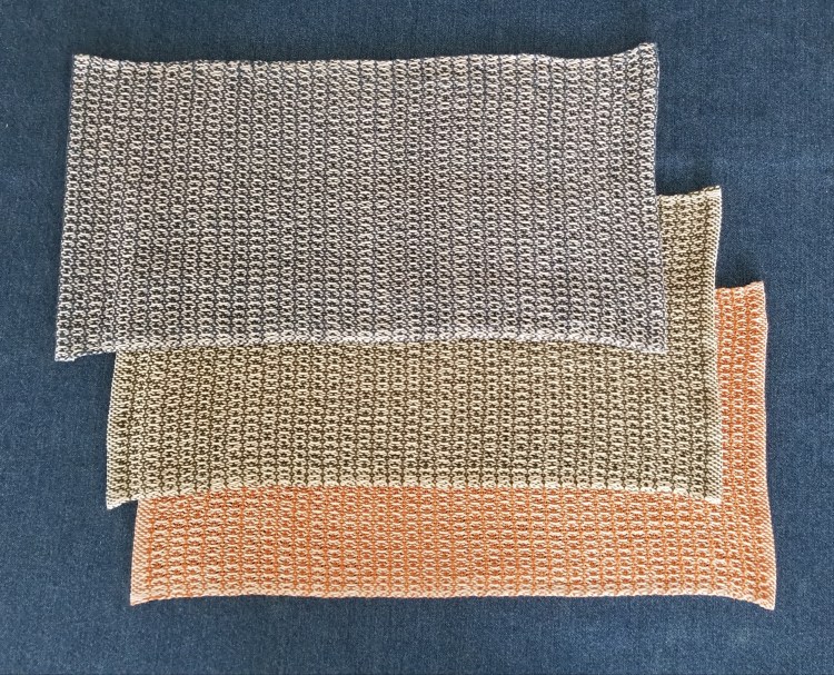For my tea towel wrapping project I used a pattern called Running Stitch Towels, designed by Christine Jablonski. The yarn is Gist Duet 55% Linen / 45% Cotton. For once I had the exact yarn they used, although my two colors do not have has much contrast as theirs. My pattern will be more subtle. Gist also has patterns for Running Stitch Placemats and Running Stitch Napkins.