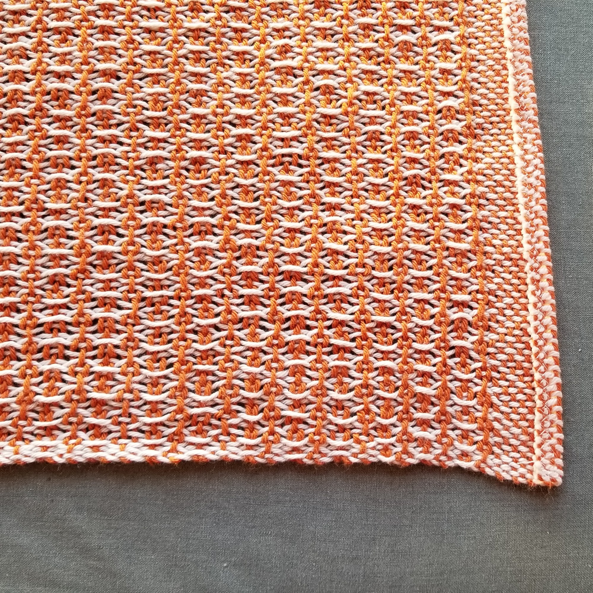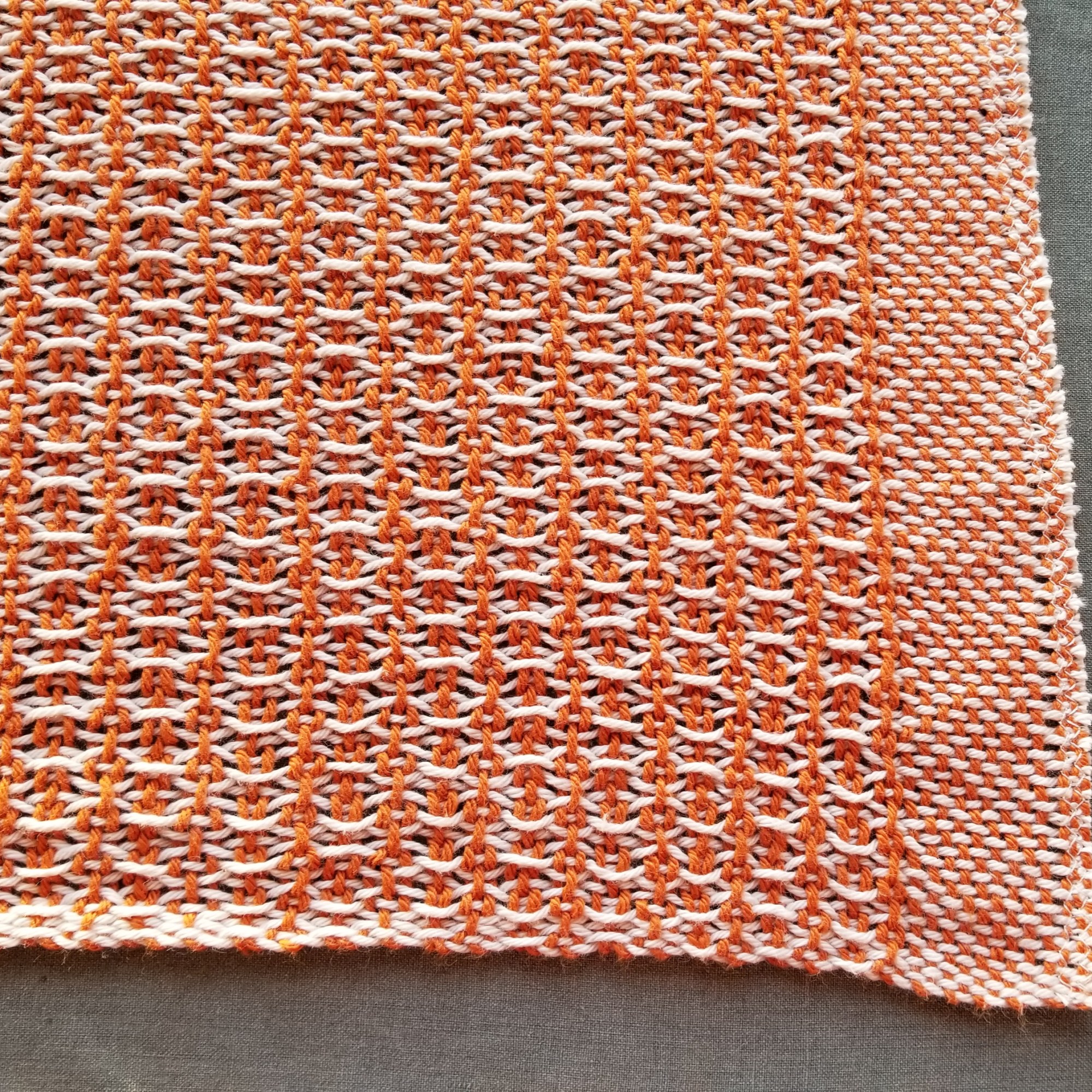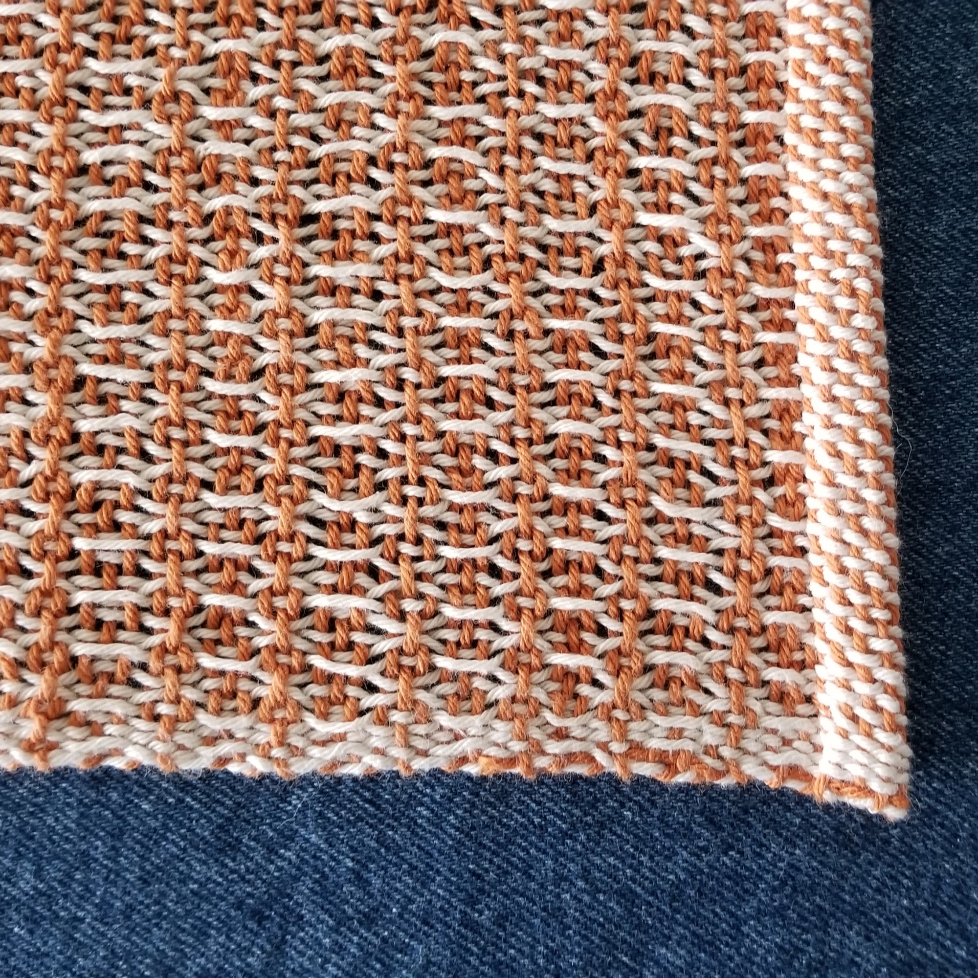 Weaving complete and removed from the loom, before weaving in ends and washingCloseup of the corner of the towel, showing the pattern of darker yarn.