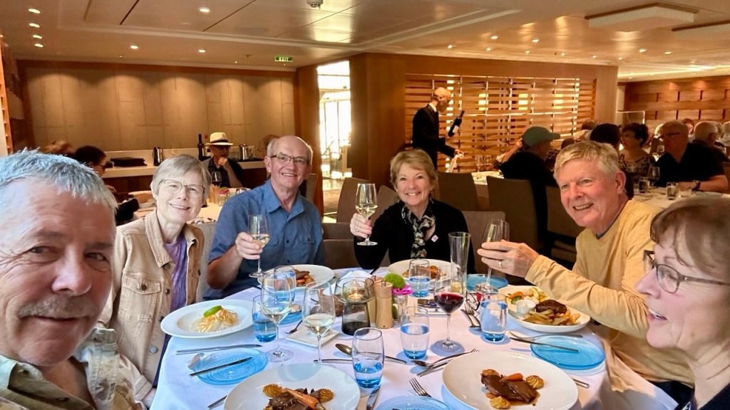 The next picture was taken by one of the waiters in the dining room on Marlene’s phone near the beginning of the cruise, but it works for a last dinner of the cruise photo also.